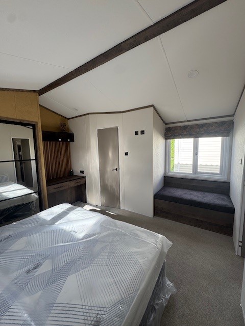 The bedrooms continue the boutique feel, with the master suite offering a luxurious king-size bed, mirrored wardrobes, a dressing area and a stylish window seat with built-in storage. A private en-suite shower room adds an extra layer of comfort and exclusivity. The second bedroom is equally well finished, with twin beds, fitted storage and quality furnishings, ideal for family or guests.