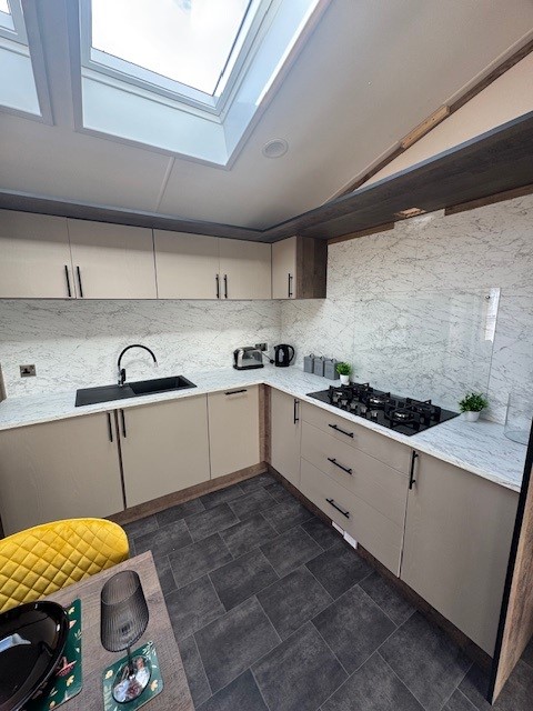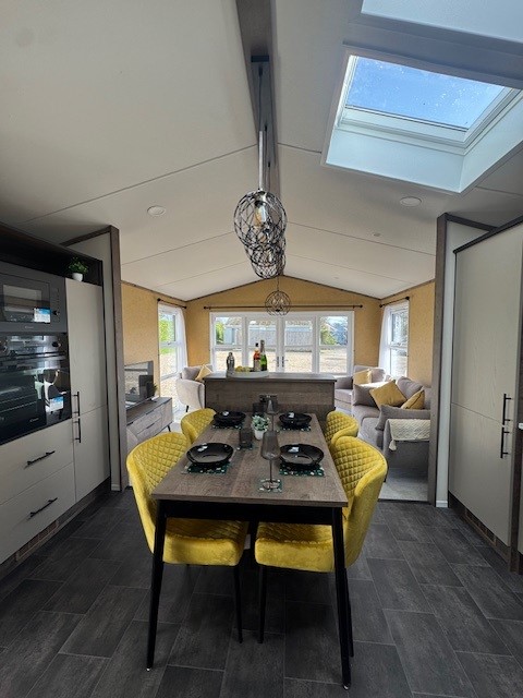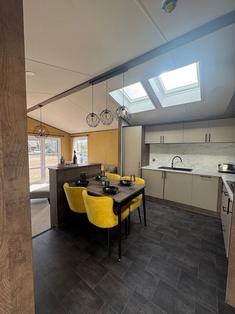 At the heart of the lodge is the stunning kitchen and dining area. Flooded with natural light from overhead Velux windows, this space blends practicality with cutting-edge design. You’ll find domestic-sized units with soft-close doors, a generous larder cupboard and a full suite of integrated appliances including a washing machine, dishwasher, microwave and fridge freezer. Finished with stylish worktops and a designer extractor, it’s a kitchen that delivers on both performance and visual impact. A freestanding dining table with designer chairs completes the setting perfectly.
