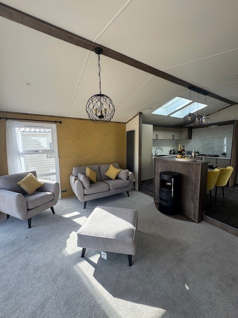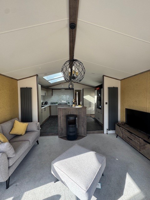 Step inside and you’re immediately struck by the sense of space, enhanced by vaulted ceilings reaching up to 9ft. The open-plan living area is both elegant and inviting, featuring beautifully styled freestanding furniture, a striking cylindrical log-burner style electric fire and a sleek, contemporary media wall. It’s a space designed for both relaxed evenings and stylish entertaining.