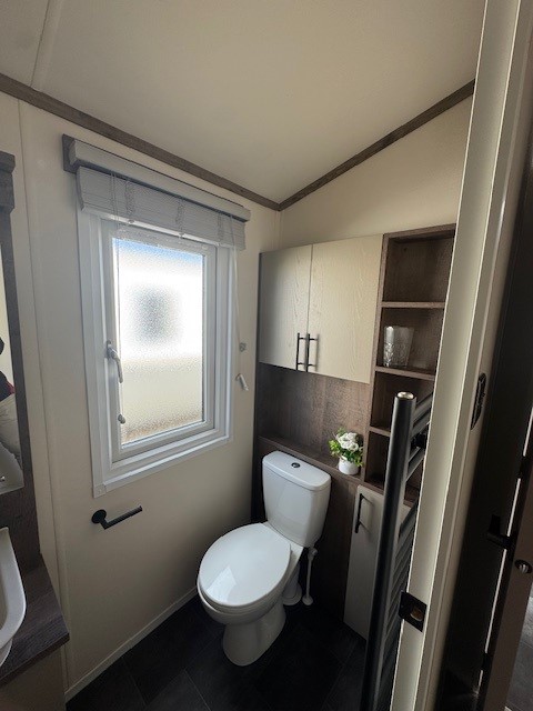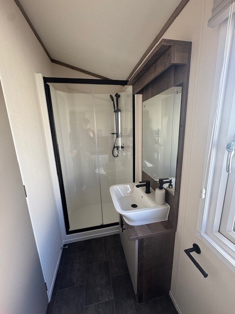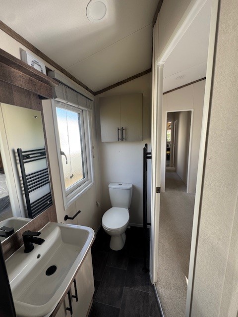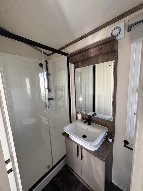 The main bathroom is finished to an equally high standard, featuring a contemporary suite and fully enclosed shower, maintaining the same level of quality seen throughout the lodge.