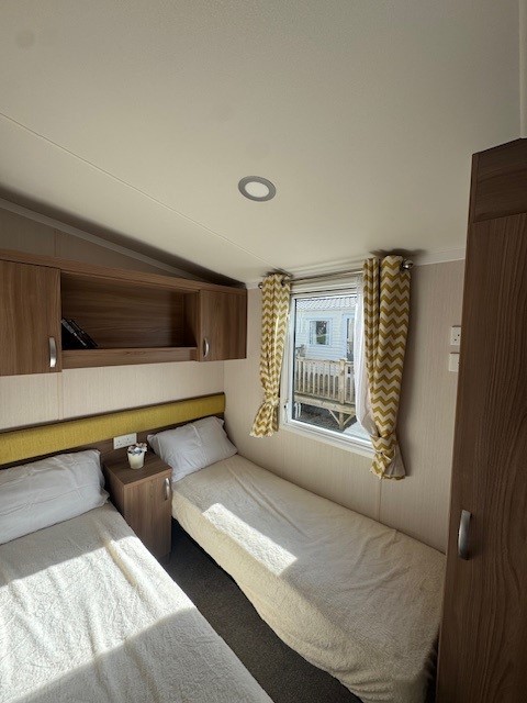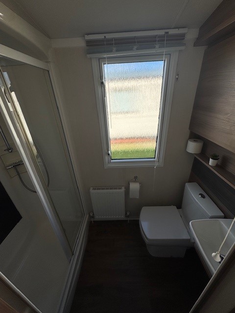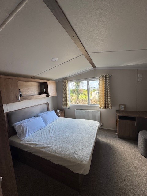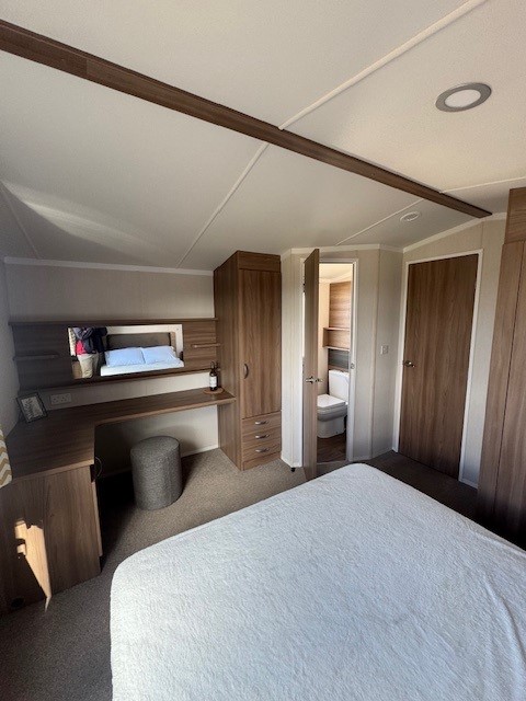 Both bedrooms are finished to a high standard with coordinated furnishings and thoughtful storage. The master bedroom offers a comfortable double bed along with its own ensuite WC, providing a private and relaxing retreat. The second twin bedroom is ideal for family or guests, while a spacious family shower room completes the accommodation.